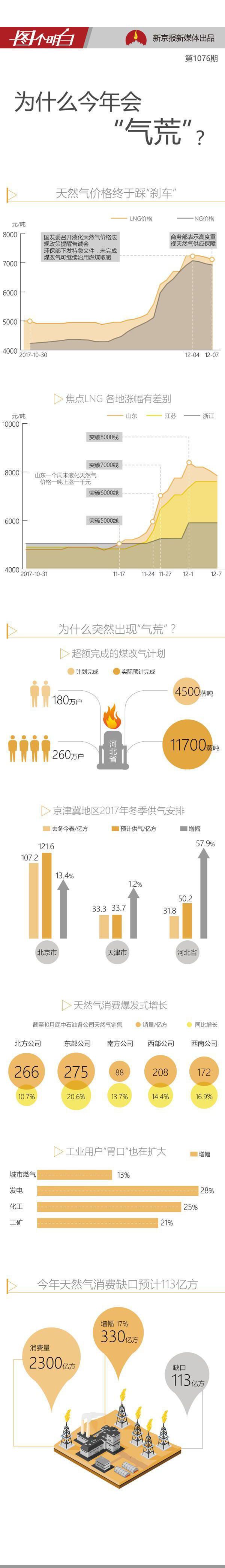 此次“氣荒”,部分因為“煤改氣”快速推進超出預期,部分地區出現天然氣供應不足,目前價格大漲的區域主要集中在華北地區,南方省份市場較為穩定;另一方面也因為近年天然氣消費量整體上漲。據三大石油公司上報數據顯示,今年,全國天然氣總缺口超過113億方。(更多可視化新聞,請訂閱新京報圖個明白)